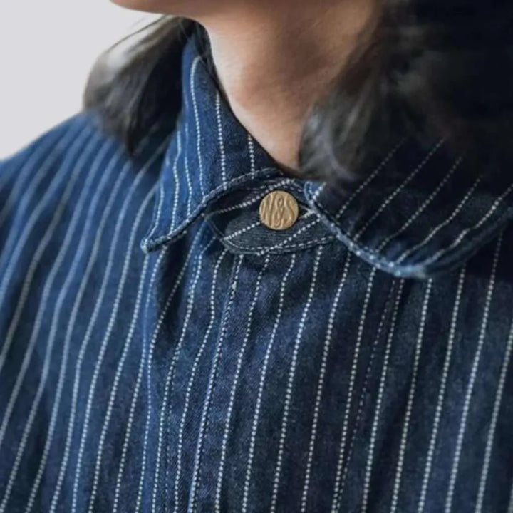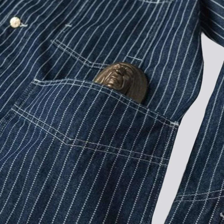 Introducing our 2023 Autumn-Winter Collection's edgy 12oz jean jacket for men a stylish combination of conventional and trendy style! With its midweight fabric, vertical stripes, medium wash and high-quality construction, this jacket is guaranteed to take your street flair to the next level.