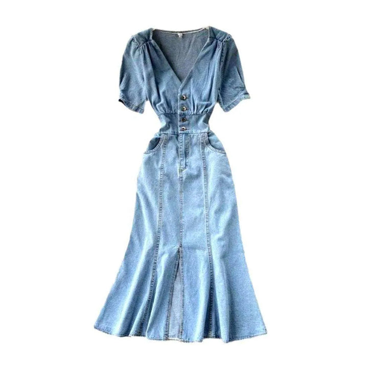 This exquisite dress, designed with the modern woman in mind, effortlessly combines comfort and style with its premium cotton and denim fabric. The light wash, street-style design offers a fresh and trendy look, perfect for making a statement at any party or casual gathering.